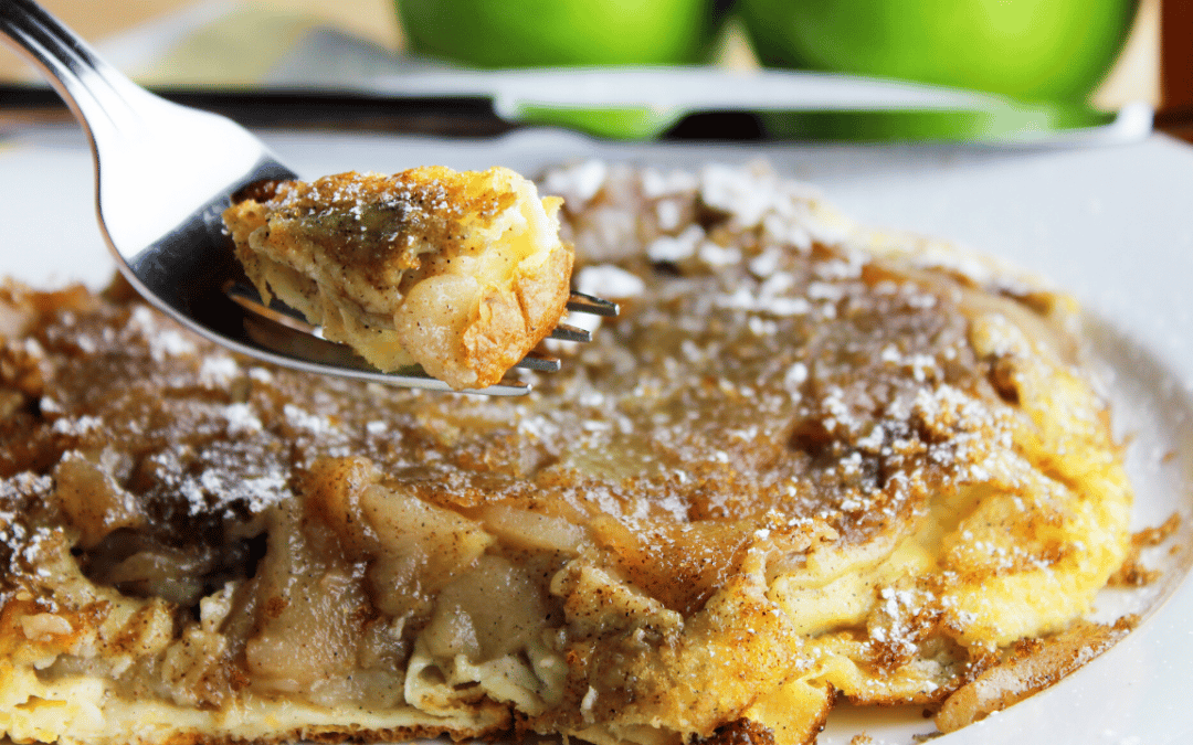 My mom and Oma (grandma) made this for me when I was growing up. I myself have never been a pancake-maker, but I had a craving for it on a cold weekend this past winter. I searched “Apfelpfannkuchen” on YouTube and watched the one that looked best and was by a German person. I didn’t have “vanilla sugar” and it took me a few minutes to convert from grams to ounces, but it turned out fine. In fact, I started making it every few weeks, with a slight adaptation or twist every time. For the first batch, I used thinly sliced apples. The next time, I grated the apples on a cheese grater and just mixed it into the batter. The two methods are equally delicious!