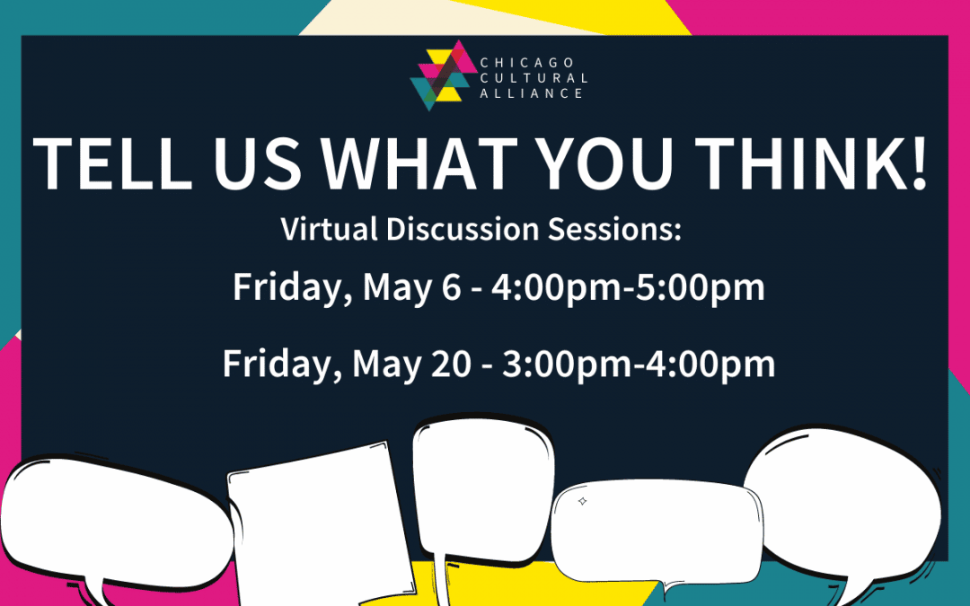 | In partnership with We Will Chicago, the Alliance staff will be hosting two virtual discussion sessions in May to hear your opinions on the city’s arts and culture infrastructure, support, and access to resources. The first discussion will take place on Friday, May 6 at 4:00pm, directly after our Virtual Town Hall, and the second will take place on Friday, May 20 at 3:00pm. You are invited to participate in either session, or both. A representative from the Driehaus Foundation will also attend these sessions to hear your concerns. Core Members can receive $100 for their organization for participating in at least one of these sessions. We will randomly choose ten attendees from either session and notify the winners on May 23. The $100 stipends will be mailed as a check from the CCA. Your valuable insights as cultural professionals can help shape the city’s priorities. We hope you will join us and share your thoughts with us and with We Will Chicago! |