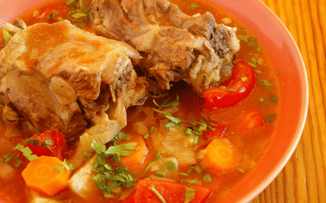 Put in large pot, with a sprinkle of both salt and pepper. Cover. Cook over low heat ( should only lightly simmer) on stove for 4 to 6 hours, until meat is very tender and easily removed from the bones. Remove meat to a separate container and cool slightly, until it can be handled. Remove the bits of meat from the bones and return to the pot. Discard bones, fat and gristle. At this point this can be frozen for later, or chilled over night and the fat skimmed off. When ready to use, reheat slowly until boiling.