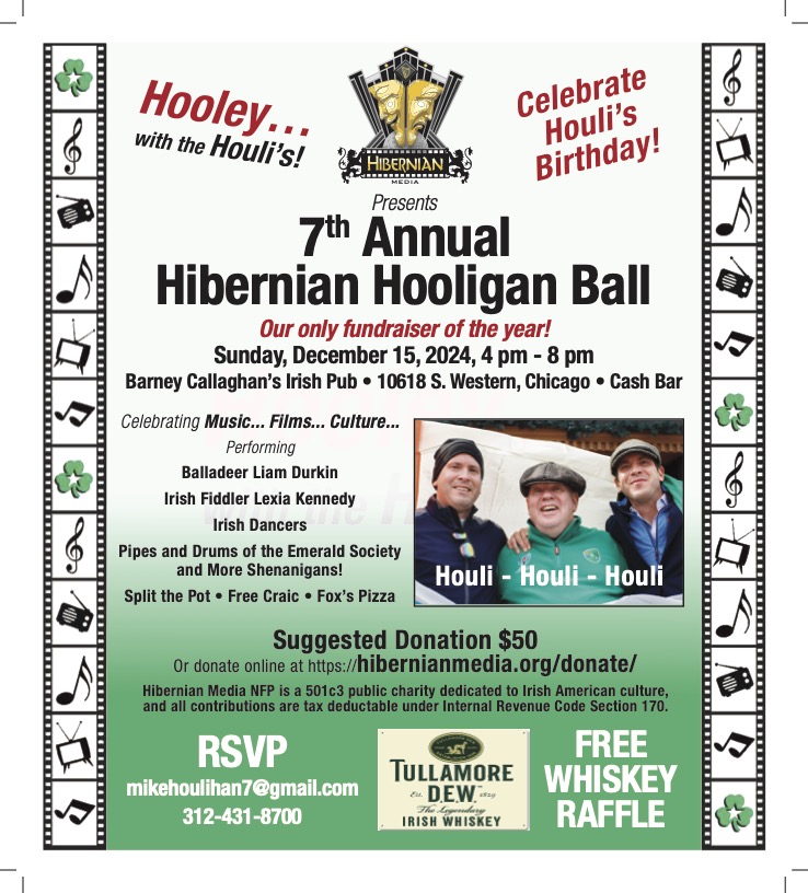 Hibernian Media presents the 7th Annual Hibernian Hooligan Ball! It's the only fundraiser of the year! Sunday, December 15, 2024, 4 pm - 8 pm Barney Callaghan's Irish Pub • 10618 S. Western, Chicago • Cash Bar   Celebrating Music... Films... Culture... Performing Balladeer Liam Durkin Irish Fiddler Lexi Kennedy Irish Dancers Pipes and Drums […]