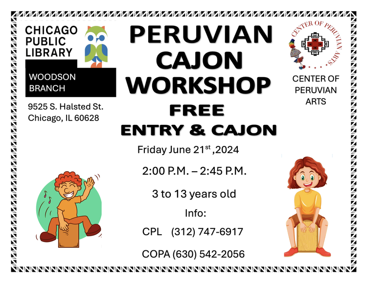 Date: Friday, June 21, 2024 Time: 2:00 PM Location: Woodson Regional Branch, 9525 South Halsted Street, Chicago, IL, 60628 Afro-Peruvian Percussion Workshop with Center for Peruvian ArtsThe center of Peruvian Arts in […]