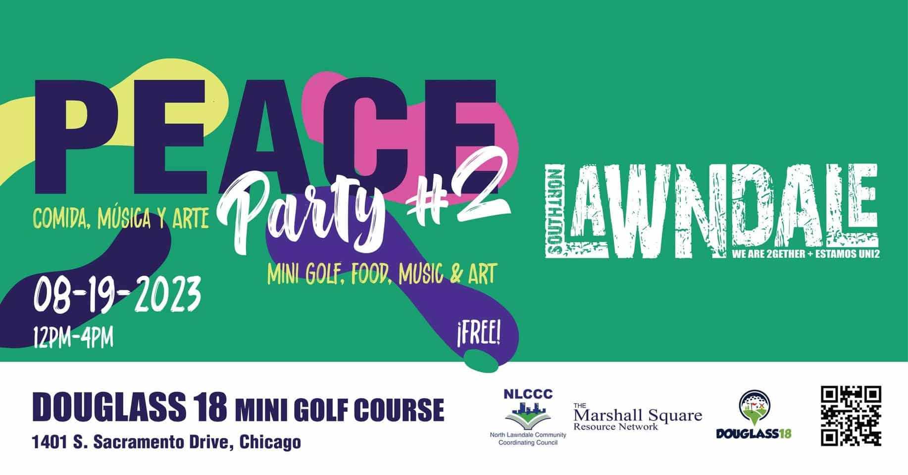 The LAWNDALE Peace Party #2 is a free event for a day full of Art, music, food, and mini golf!