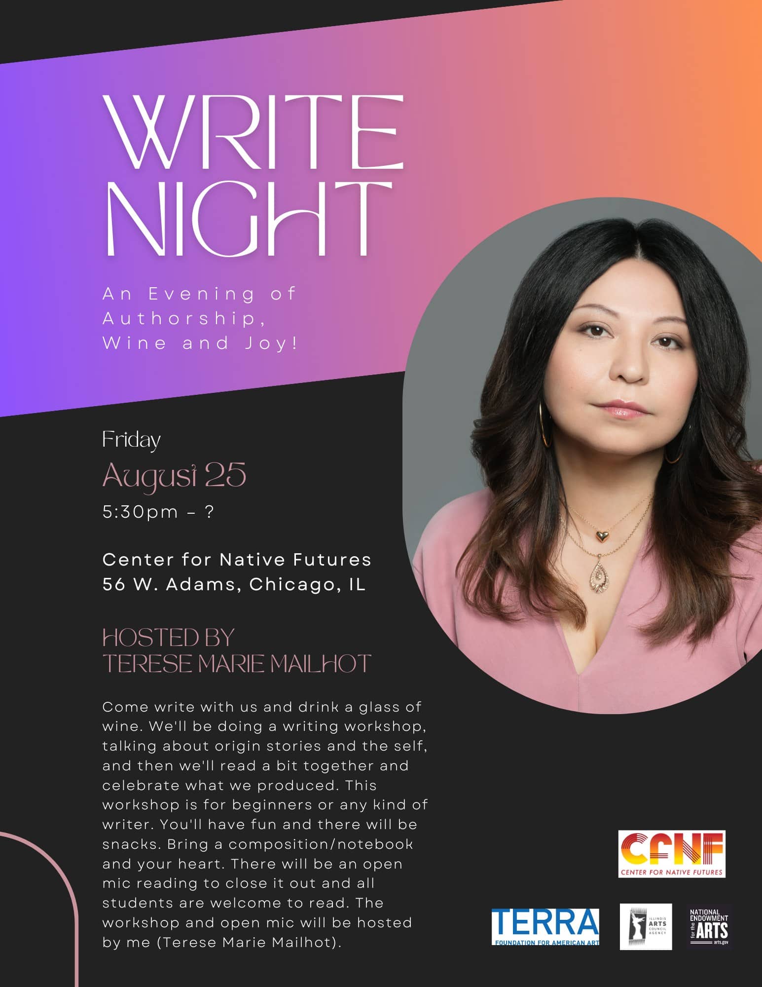 The Center for Native Futures will host a writing workshop, talking about origin stories and the self, and then participants will read together and celebrate what they produced.