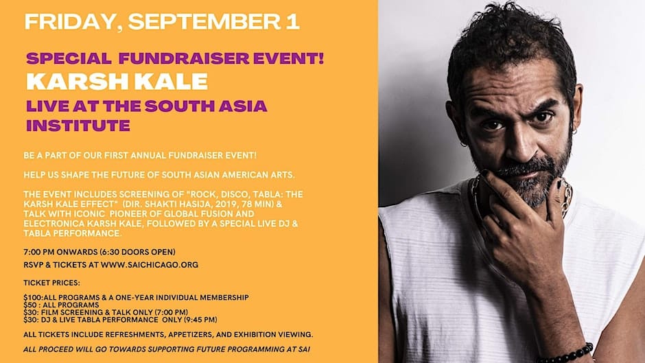 Be part of the First Annual SAI Fundraiser event and help shape the future of South Asian Arts. Musician, DJ and composer Karsh Kale will host a film screening and live performance.