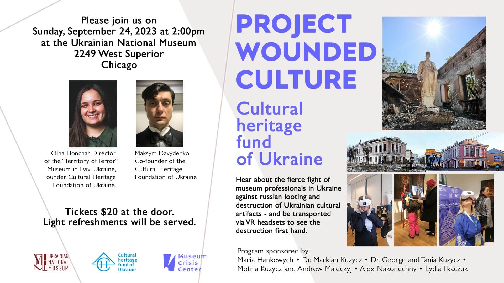 Free Hear about the fierce fight of museum professionals in Ukraine against russian looting and destruction of Ukrainian cultural artifacts - and be transported via VR headsets to see the destruction first hand.