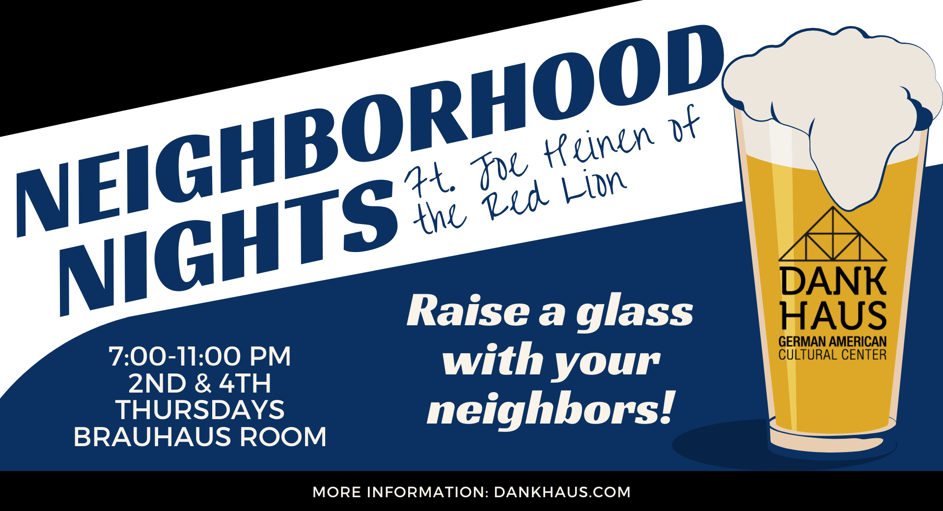 COME ENJOY A BEVERAGE WITH A SPECTACULAR EXPERIENCE IN OUR ICONIC 2ND FLOOR BRAUHAUS ROOM A perfect place to meet your neighbors and socialize! Each 2nd & 4th Thursday of the month from 7-11 PM. Proceeds support the DANK Haus Museum