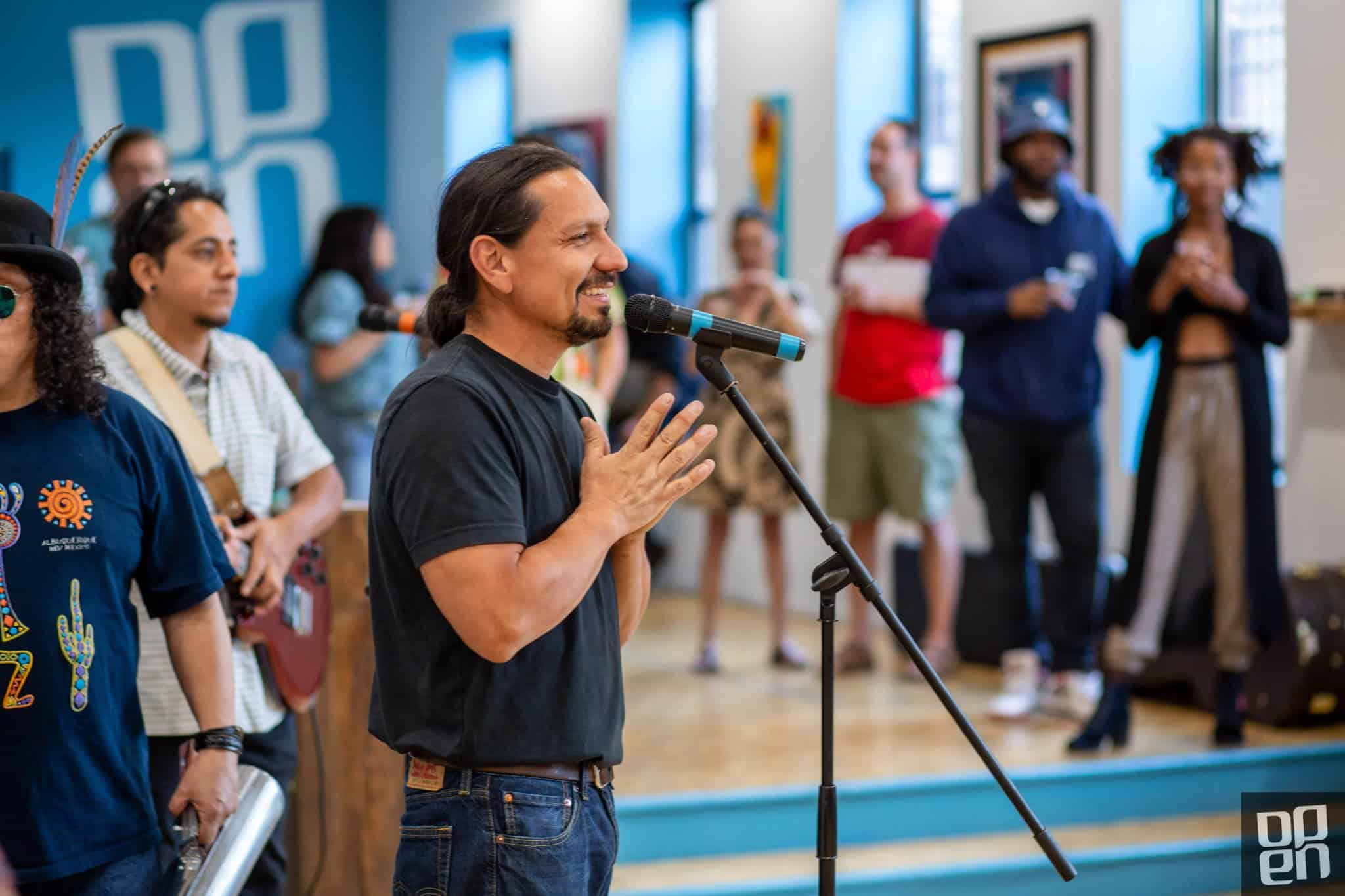 Founder and Executive Director Omar Magana addresses the crowd at OPEN Center for the Arts’ 8th Anniversary party. Photo courtesy of OPEN Center for the Arts