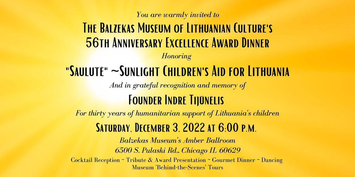 This year, the Award of Excellence will be presented to the Illinois-based charity “Saulutė” ~ Sunlight Children’s Aid for Lithuania and posthumously to the organization’s founder, Mrs. Indrė Tijūnėlis. Born from her initiative, vision, and resolve, Sunlight Children’s Aid has brought light to hundreds of Lithuania’s neediest children and raised over $4 million dollars to date, thanks to the volunteers and donors who lent a hand along the way. Now in its thirtieth year with the next generation of leaders at its helm, Sunlight Children’s Aid continues to grow and expand its reach to ensure that all Lithuania’s children thrive and achieve their fullest potential.
