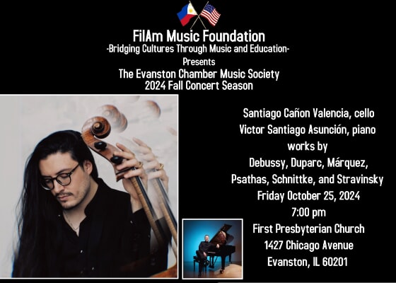 Cellist phenom Santiago Cañon Valencia, winner of the Tchaikovsky and Queen Elisabeth Competitions, and Janos Starker Awardee debuts in Evanston with the Steinway Artist Victor Santiago Asunción, founder and artistic director of the Evanston Chamber Music Society.