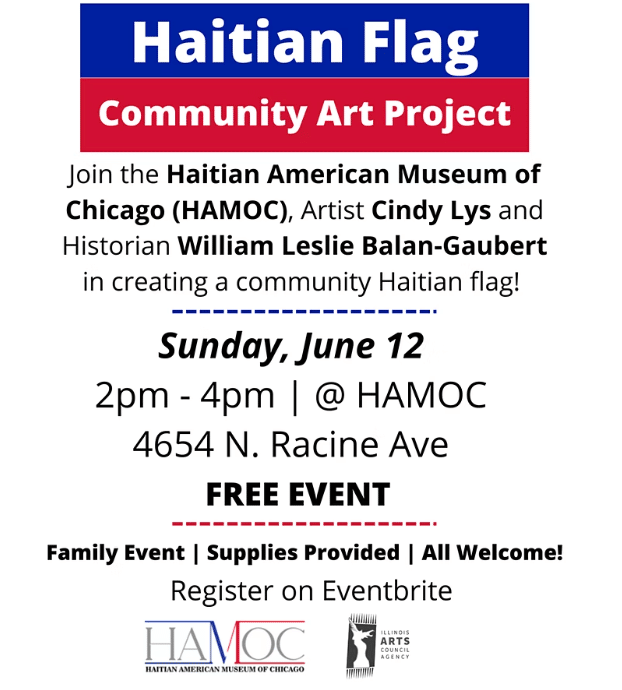 Join us for a family-friendly art project in creating a community Haitian flag! Come learn about the history and significance of Haiti’s flags, with a presentation by Historian William Leslie Balan-Gaubert and create a piece of a soon-to-be flag with Haitian, Chicago Artist Cindy Lys!