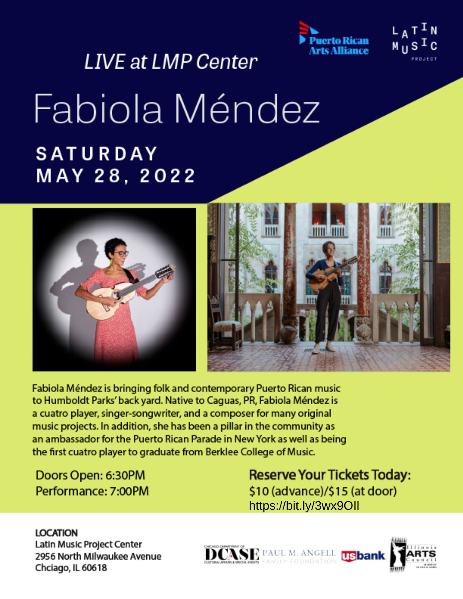 Fabiola Méndez is bringing folk and contemporary Puerto Rican music to Humboldt Park’s back yard. Native to Caguas, PR, Fabiola Méndez is a cuatro player, singer-songwriter, and a composer for many original music projects. In addition, she has been a pillar in the community as an ambassador for the Puerto Rican Parade in New York as well as being the first cuatro player to graduate from Berklee College of Music.