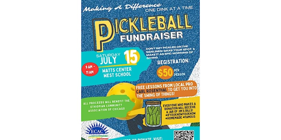 The Ethiopian Community Association of Chicago invites you to a pickleball fundraiser for refugees and immigrants. Participate in a tournament, in open play, or take free lessons.
