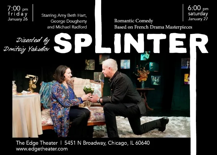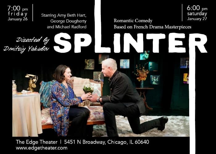 After a glorious Chicagoland premiere of Splinter: A Romantic Comedy in Wheeling and Evanston, IL, the play will be performed again at The Edge Theater at 5451 N Broadway, Chicago, IL 60640 on Friday January 26th at 7:00 p.m. and Saturday January 27th at 6:00 p.m.