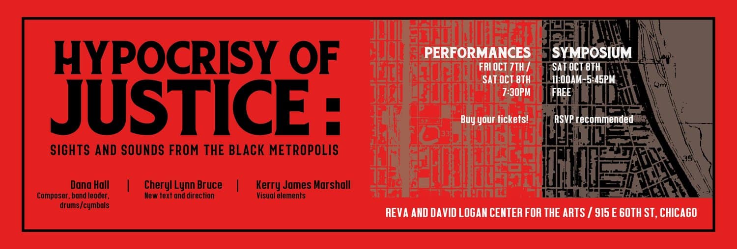 Since the 2015 premiere of “Hypocrisy of Justice,” collaborating artists Dana Hall, Cheryl Lynn Bruce, and Kerry James Marshall have expressed interest in further developing and remounting the project. There has also been an interest expressed by the artists, the Hyde Park Jazz Festival, the Logan Center for the Arts, the University of Chicago Presents, various South Side organizations, and several departments at the University of Chicago in building a convening in connection with the performances to engage in cross-sectoral conversations centering the many structural issues the novel brings forth, particularly intersecting inequities within systems and institutions, along with the lived experience of confinement, redemption, hope, and the idea of home. On Saturday, October 8th, 2022, the Chicago community is invited to participate in four 75–minute moderated discussions and other activations with activist/organizers, scholars, journalists, practitioners, and artists. The convening is free to attend. We encourage you to RSVP. All symposium activities are hosted by the Logan Center.