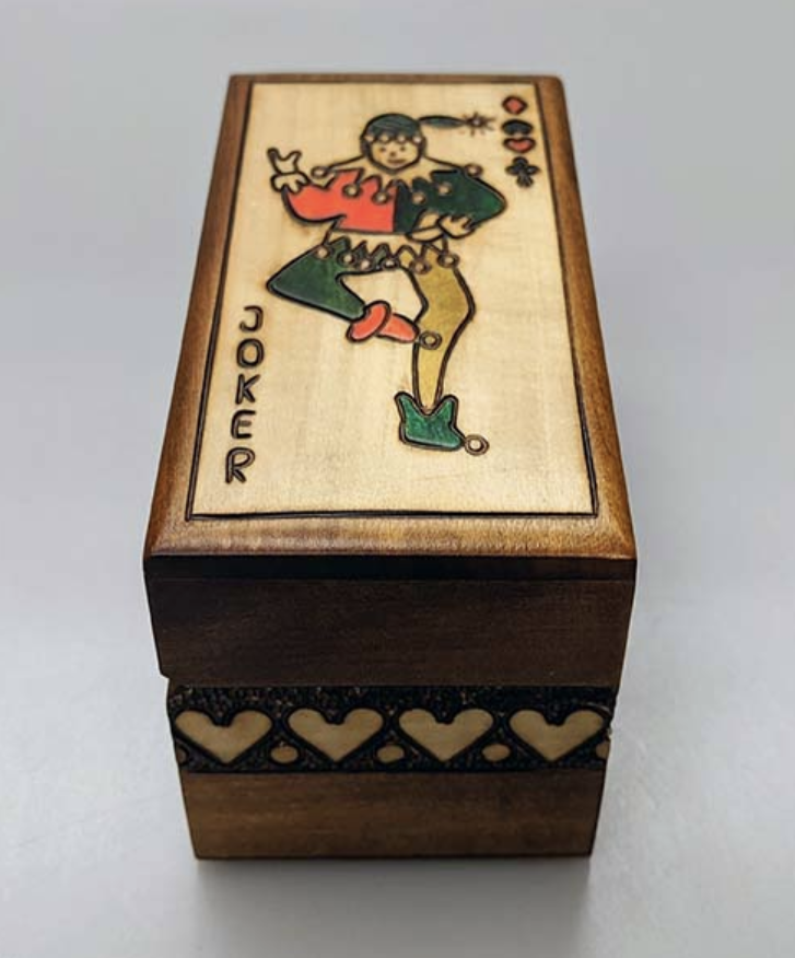 A brown wooden box with a Joker card design. Holds 2 decks of cards.