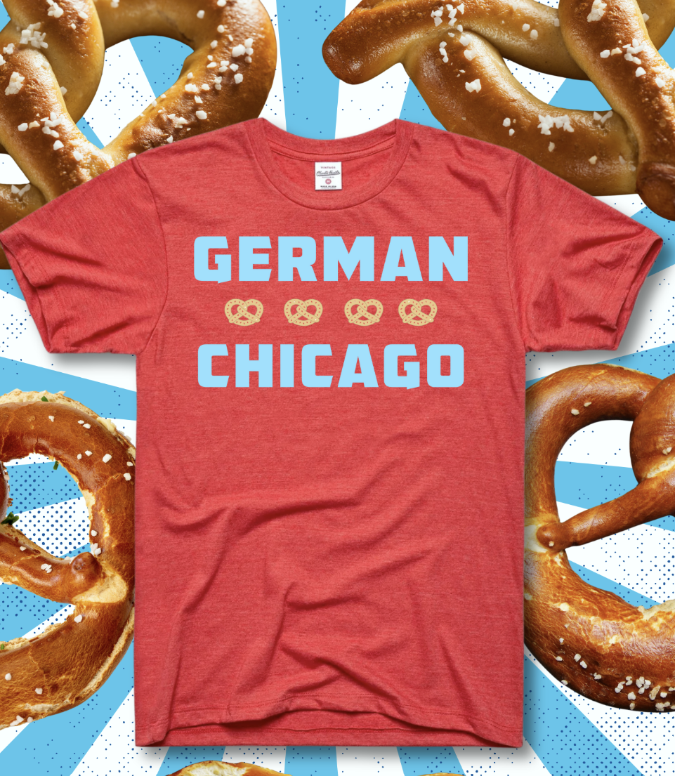 Heathered Red tshirt with German Chicago on the front and DANK Haus logo on the back.