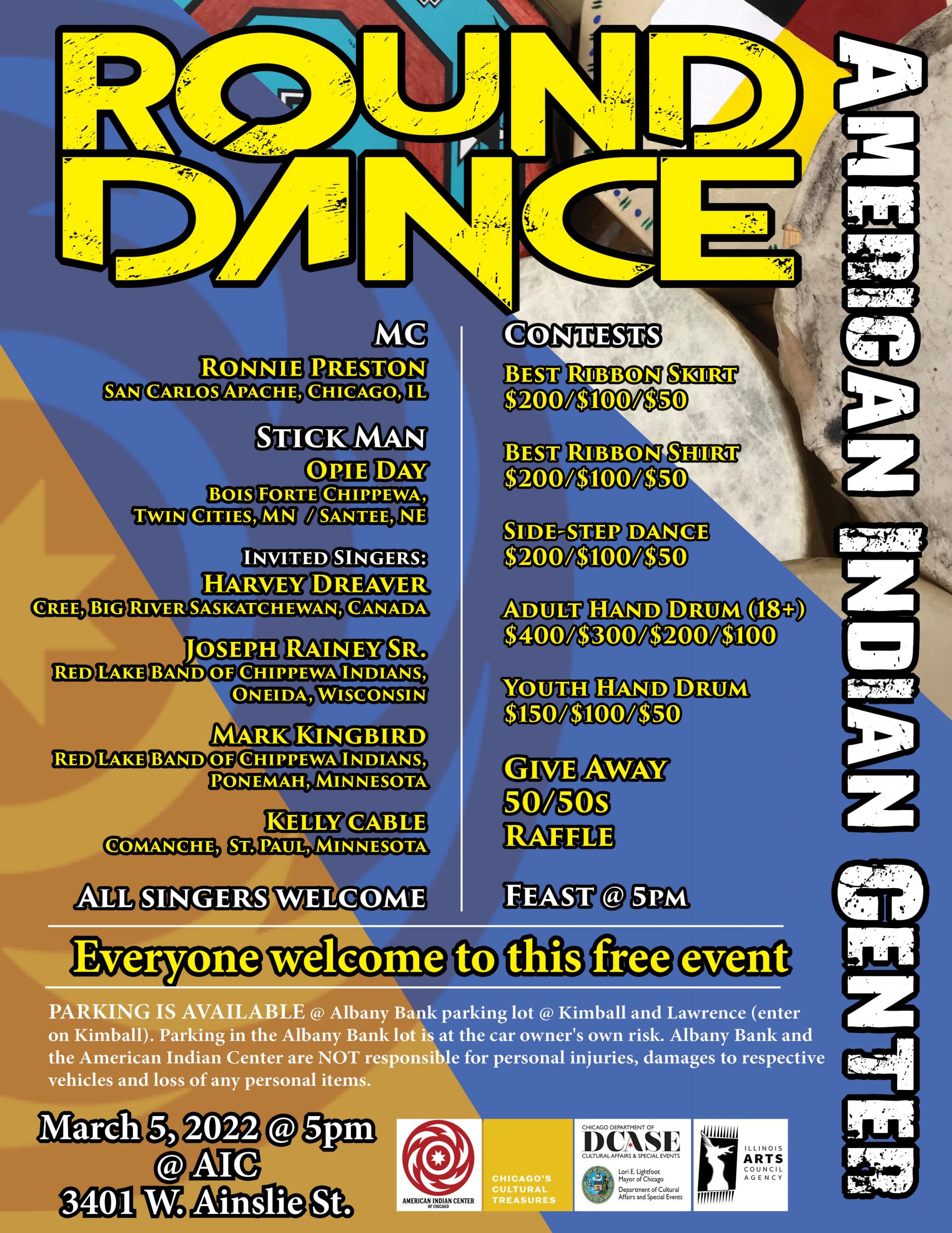 American Indian Center 3401 West Ainslie Street, Chicago, IL, United StatesEveryone welcome to the Round Dance at the American Indian Center, with a feast, dancing, singing, performers, contests, vendors, and more.