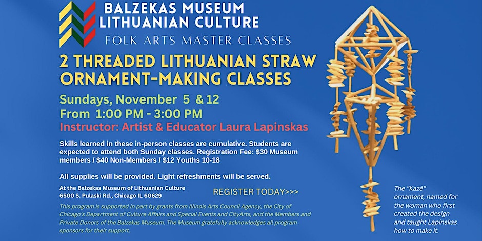The Balzekas Museum presents an in-person 3-Thursday Lithuanian Straw Ornament Making Master Class with artist/educator Laura Lapinskas About this event In order to preserve and perpetuate Lithuanian traditions, the Balzekas Museum is launching a series of traditional Lithuanian Folk Arts Master Classes. The first Master Class - on making traditional Lithuanian straw Christmas ornaments-- will […]