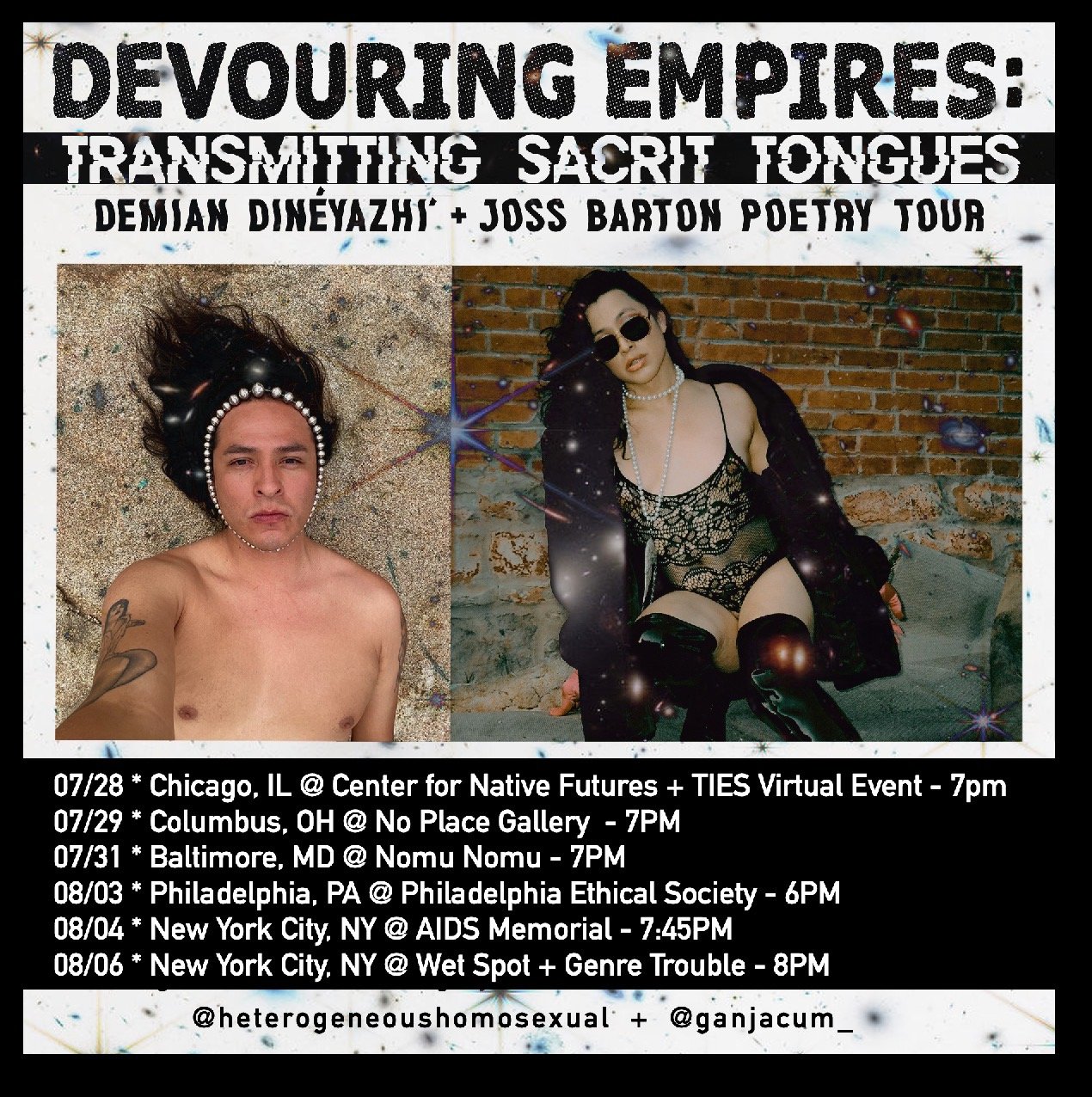 TIES is excited to announce DEVOURING EMPIRES, an evening of poetry by Demian DinéYazhi' @heterogeneoushomosexual and Joss Barton @ganjacum_! Join us Thursday, July 28 at 7 pm CDT for this virtual event hosted by TIES and @centernativefutures. Register for free at the link in our bio or bit.ly/devour7 _______________ Devouring Empires is a Trans, Non-Binary, and […]