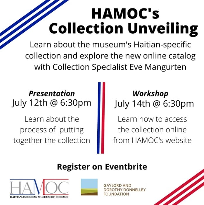 Through a generous grant from the Gaylord and Dorothy Donnelley Foundation, the Haitian American Museum of Chicago (HAMOC) was able to hire a Collection Specialist, Eve Mangurten, to catalog the museum's Haitian-specific Collection of art and artifacts. Join HAMOC and Eve in two events: July 12: Presentation - Learn about Eve's process of cataloging the […]