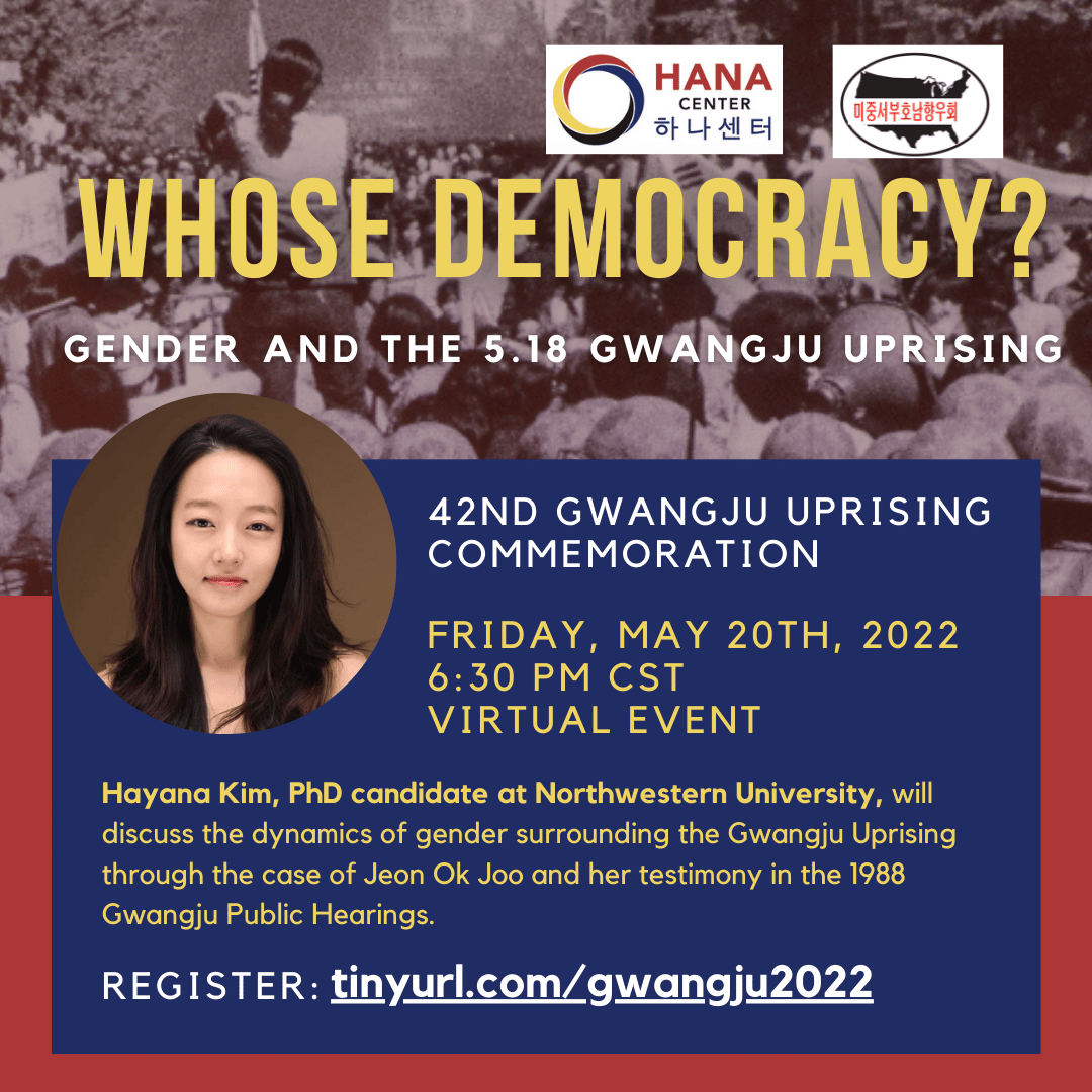 Join HANA this Friday as we commemorate the 42nd anniversary of the Gwangju Uprising! On May 18, 1980, democracy activists, students, and opposition leaders led a 9-day uprising in the South Korean city of Gwangju against martial law and the military dictatorship government of Chun Doo-Hwan. It is considered to have been a pivotal moment […]