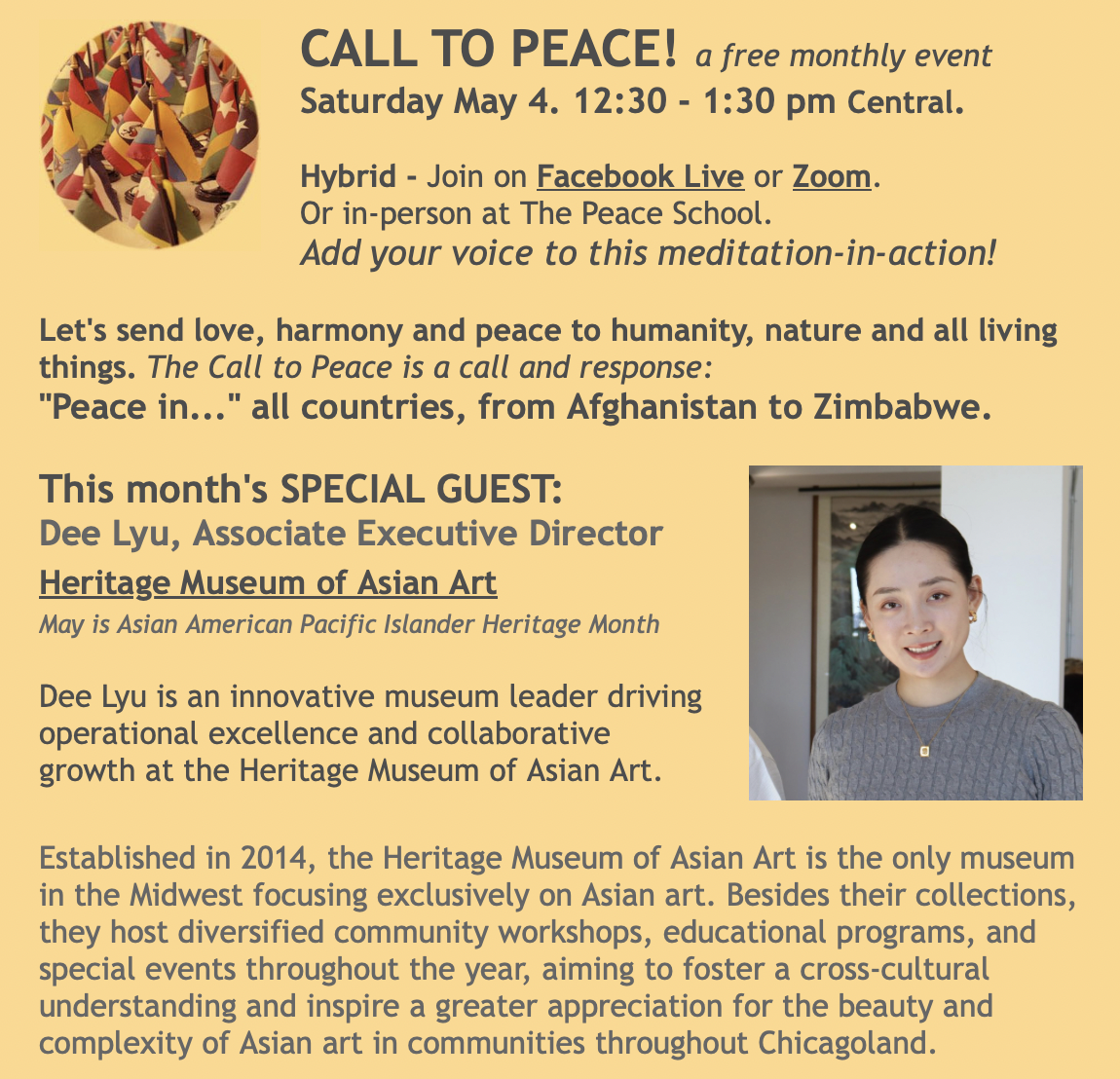 Let's send love, harmony and peace to humanity, nature and all living things. The Call to Peace is a call and response: "Peace in..." all countries, from Afghanistan to Zimbabwe. This month's SPECIAL GUEST: Dee Lyu, Associate Executive Director Heritage Museum of Asian Art May is Asian American Pacific Islander Heritage Month Dee Lyu is […]