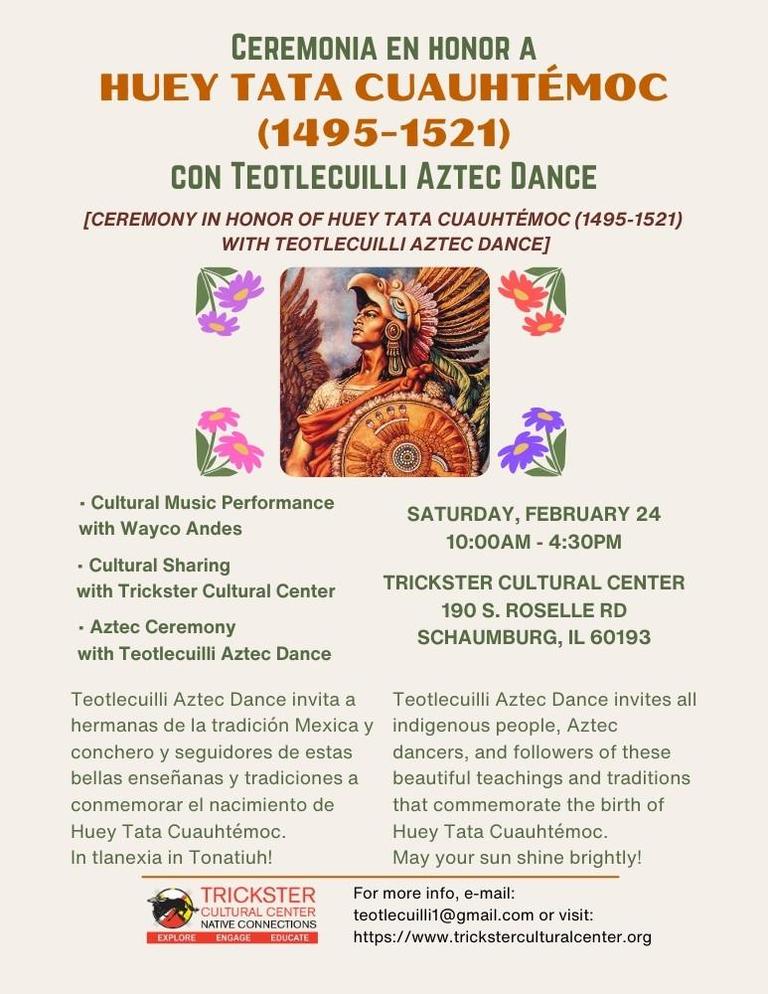 Teotlecuilli Aztec Dance invites all indigenous people, Aztec dancers, and followers of these beautiful teachings and traditions that commemorate the birth of Huey Tata Cuauhtémoc. May your sun shine brightly!