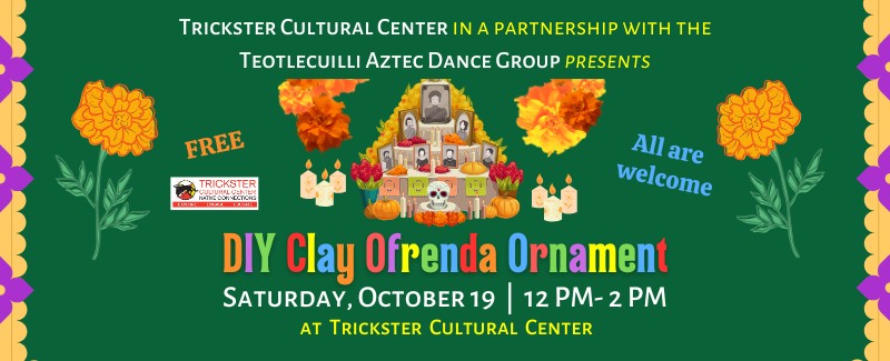 Join us at Trickster Cultural Center on Oct 19th from 12pm-2pm to celebrate a tradition of decorating altars for Dia de los Muertos (Day of the Dead). This DIY Clay Ofrenda Ornament workshop is free and all are welcome. This workshop also marks the start of our month-long Dia de los Muertos (Day of the […]