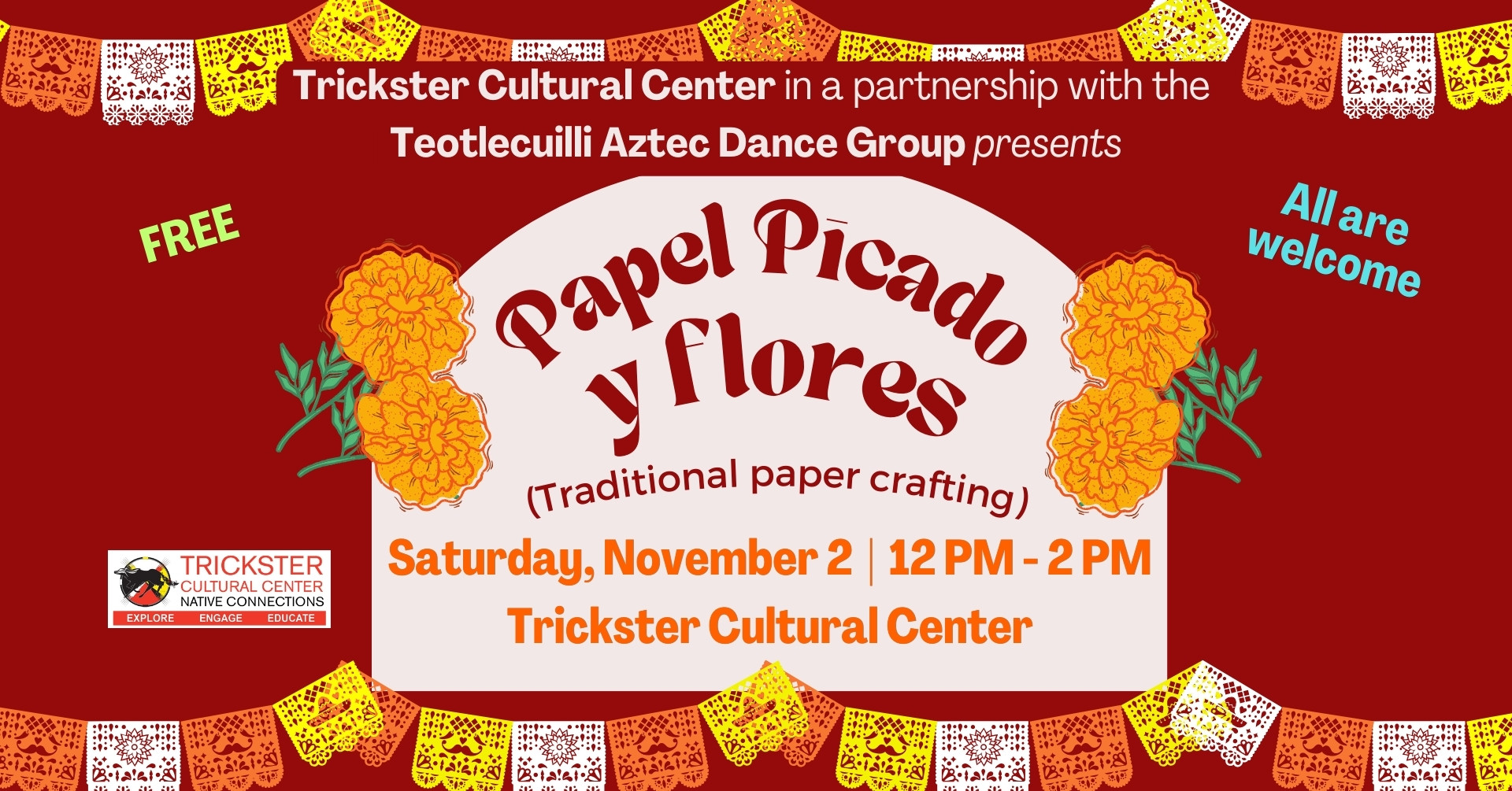 Join us and learn how to make papel picado, a traditional Mexican decorative craft, and flowers to decorate an ofrenda (altar). This event is free and all are welcome.
