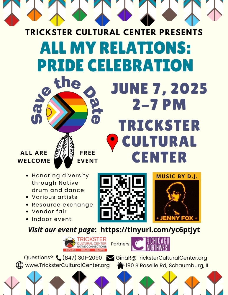 The 2025 "All My Relations: Pride Celebration" would like to honor diversity through Native drum and dance, various artists, resource exchanges, and vendor fair at Trickster Cultural Center in Schaumburg, IL.