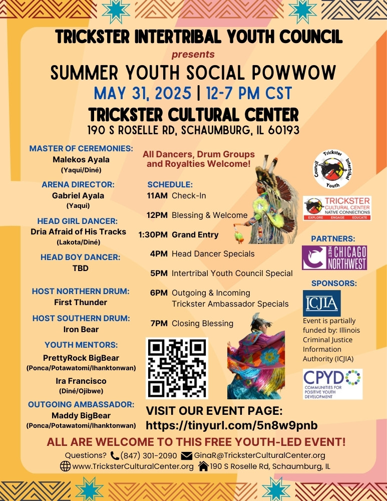 This youth-led community event is FREE and open to the general public event. This "Summer Youth Social Powwow" event aims to foster community relations, youth literacy, cultural exchange with a powwow and provide local community resources at Trickster Cultural Center.