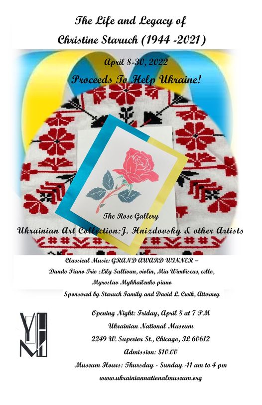 The Ukrainian National Museum invites you to a new art exhibition opening Friday, April 8, at 7pm, celebrating the life and legacy of Christine Staruch. Christine was a staunch supporter of Ukrainian culture and arts, who immigrated to Chicago after World War II. Later in life she became the owner of the Rose Gallery, where […]