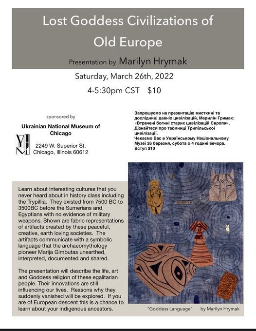 The Ukrainian National Museum invites you to a presentation of on ancient civilizations by scholar Marilyn Hrymak. Learn about the mysteries of the Tryipillia civilization, who existed from 7500 BC to 3500 BC, before the Sumerians and Egyptians, with no evidence of military weapons. Hrymak's presentation will describe the life, art and Goddess religion of […]