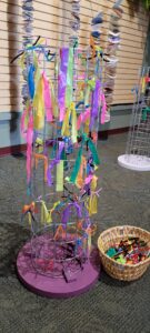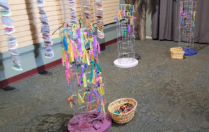 Weaving Columns- Interactive and collaborative work of art that morphs over time as children and adults add colored ribbons and pipe cleaners to the structure.